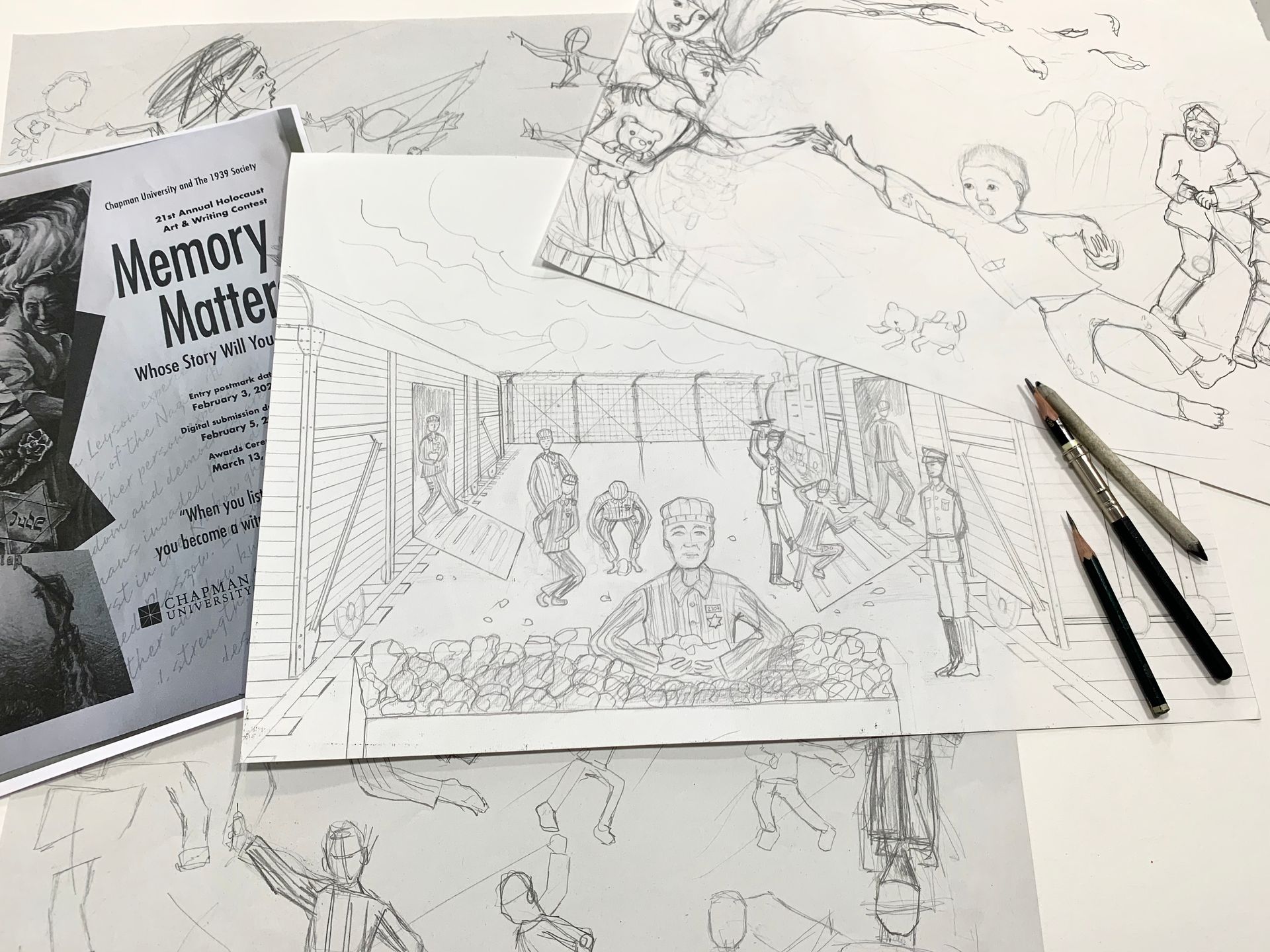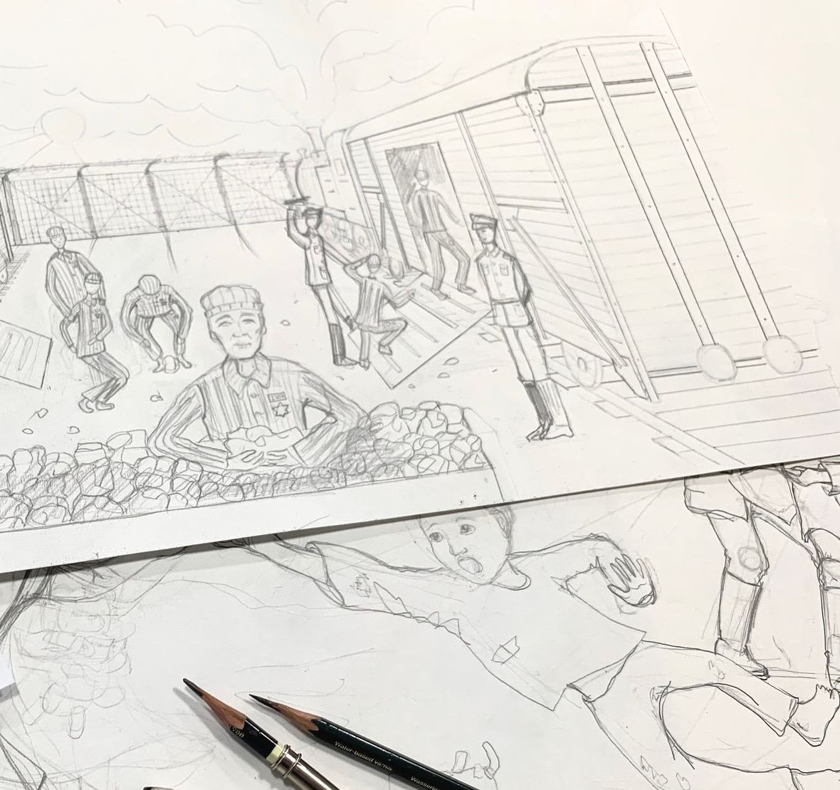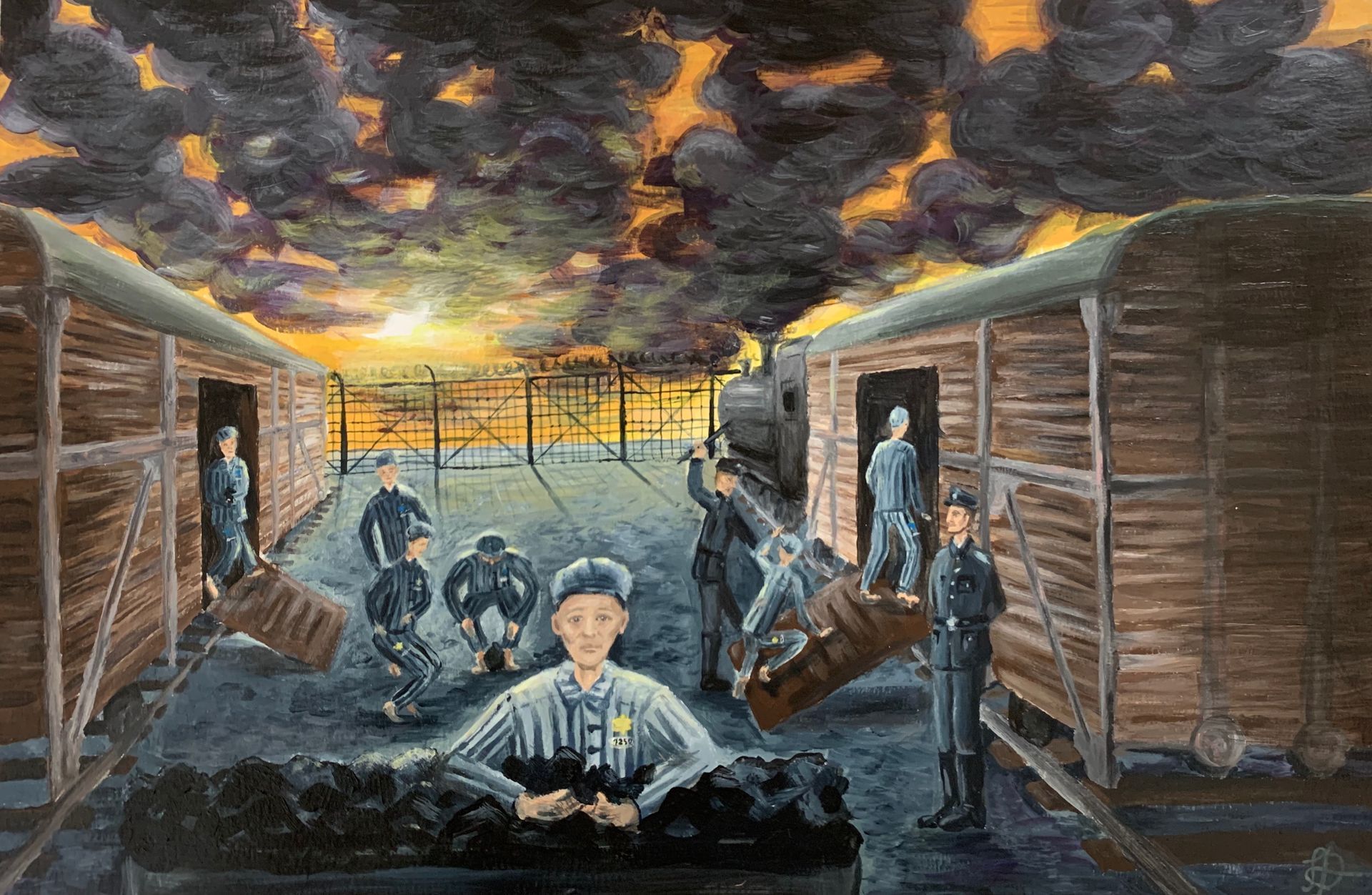 My artwork shows a scene from the Magdeburg labour camp. The prisoners had to load coal from trains and some of them were too weak to carry the heavy lumps due to hunger, which is why they often collapsed. That they were not punished and beaten up by the guards, the fellow prisoners helped them.