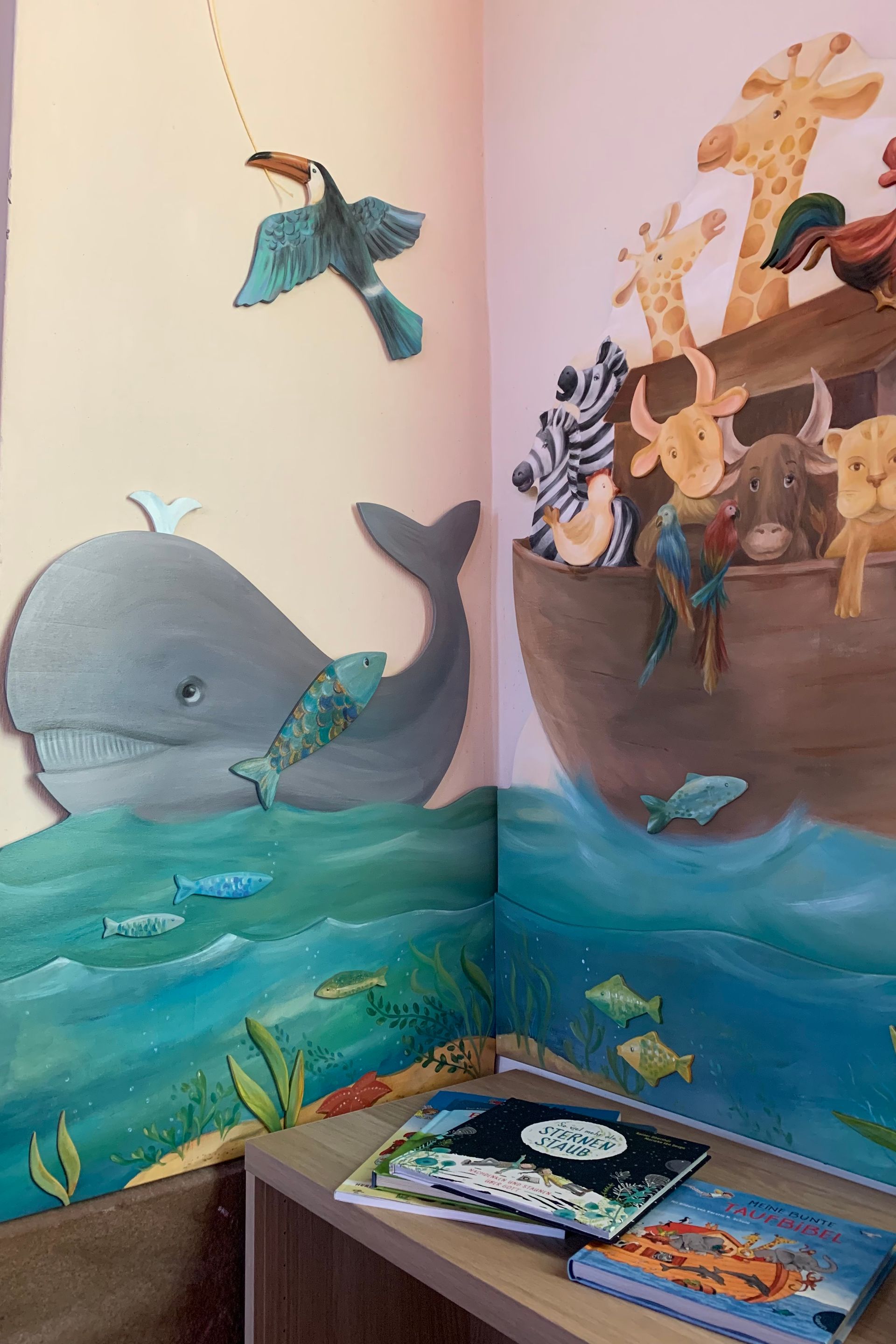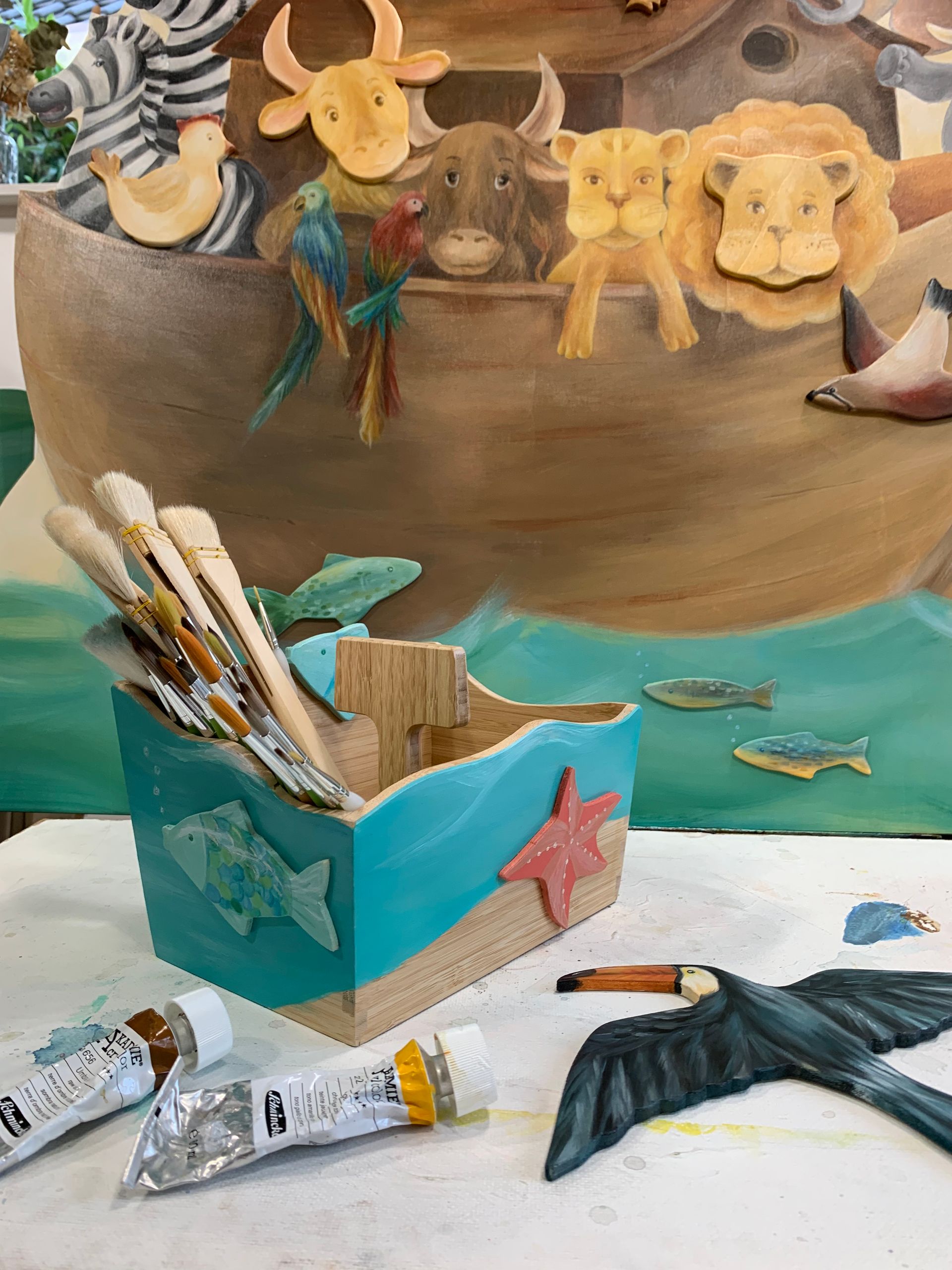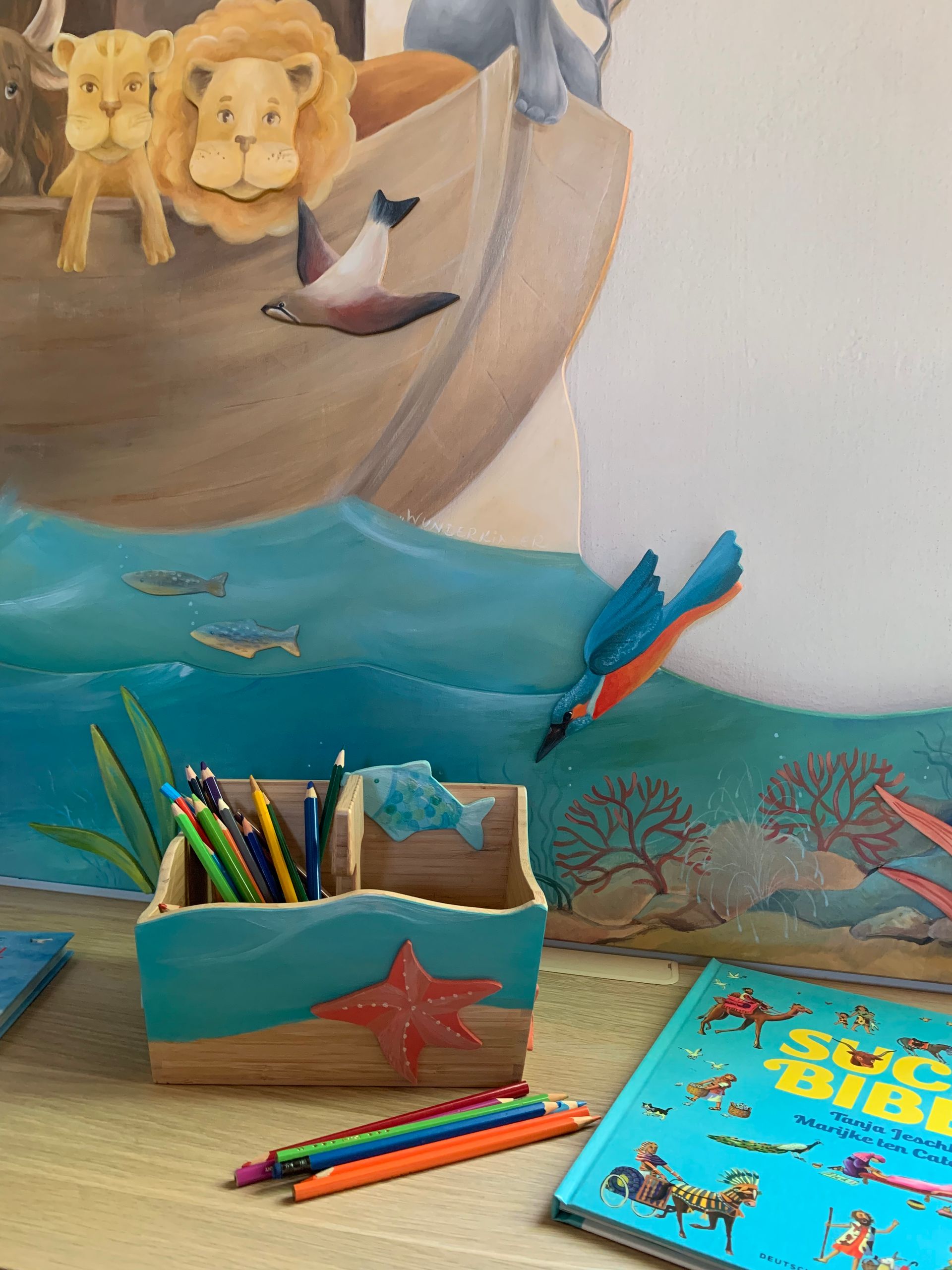 Es wurde fleißig entworfen, geplant, gezeichnet und gesägt, geschliffen und gebohrt. Wir haben uns für die Schöpfungsgeschichte und das von Kindern geliebte Thema Arche Noahs entschieden. Dazu kam viel Farbe, viele kreative Stunden und noch mehr Liebe zum Detail!